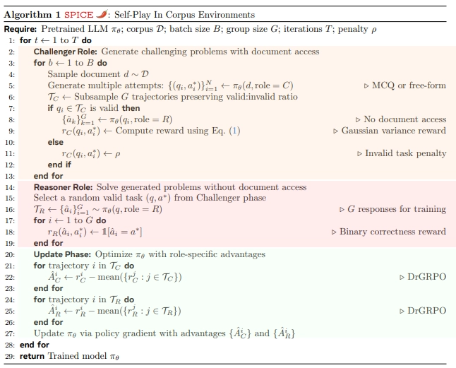 본 논문에서는 SPICE(Self-Play In Corpus Environments)라는 강화 학습 프레임워크를 소개함