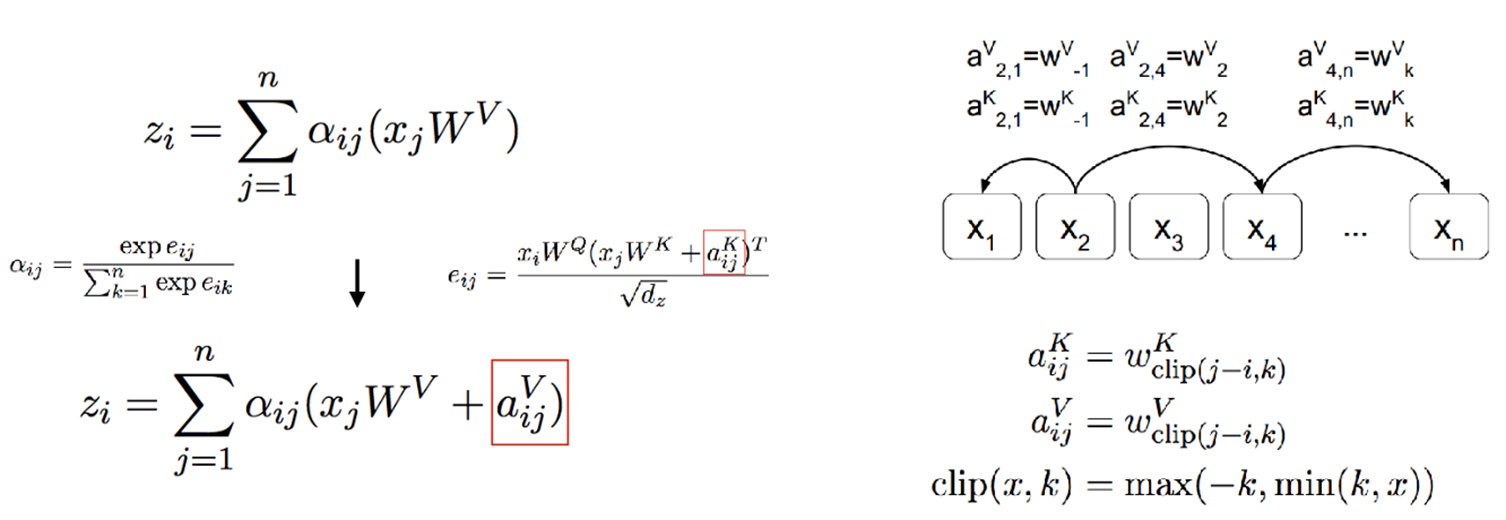 Attention score를 구하는 과정에서 key, query의 상대적인 거리를 더해주는 방법