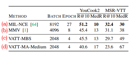 - 더 큰 배치사이즈(8192)를 사용해서 더 오랜 에폭 동안(6 에폭) 학습하자, VATT의 성능은 YouCook2에서MIL-NCE와 완전히 성능을 얻었고, MSRVTT에서 R@10 29.2 / MedR 42를 얻었다.