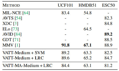 그 결과 VATT는 MMV에서 사용한 최고 성능의 CNN기반 모델보다 좋은 성능을 내지 못했지만, 다른 베이스라인 모델과는 비견할 만한 성능을 보였다. 이 결과로 미루어볼 때, VATT의 백본은 선형적으로 분리 가능한 feature을 덜 학습한 것으로 보인다. 특히 contrastive estimation head가 비선형적인 projection을 사용할 때 이런 결과는 확연했다.