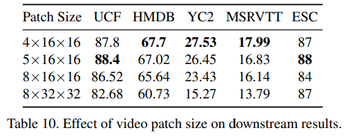 위 실험에서 가장 좋게 나온 프레임 크기를 유지한 채, 비디오 패치 크기를 변경해보았다. 시간, 혹은 공간 차원에 있어 4x16x16을 넘어가는 패치를 사용하는 것은 성능에 있어 좋지 않았다. 이 패치 크기보다 작게 할 경우, 실험 시간이 너무 오래 걸리기 때문에 그런 실험은 하지 않았다.