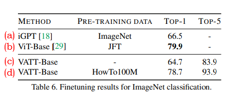 결과표는 백본 구조를 수정하지 않은 채 VATT를 ImageNet에 fine-tuning 한 성능을 보여준다.