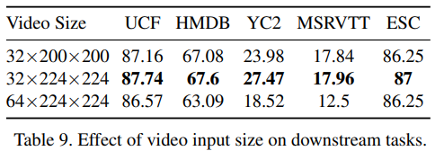 이 부분을 조사하기 위해 먼저 비디오에서 샘플링한 프레임의 개수와 크롭 사이즈를 변경하되, 패치 크기는 5x16x16으로 유지해 실험해보았다. 그 결과, 크롭 사이즈를 작게 하거나 프레임 수를 크게 하면 영상 관련 태스크 성능 저하를 가져왔으나, 오디오 분류에는 영향이 크게 없는 것으로 나타났다.