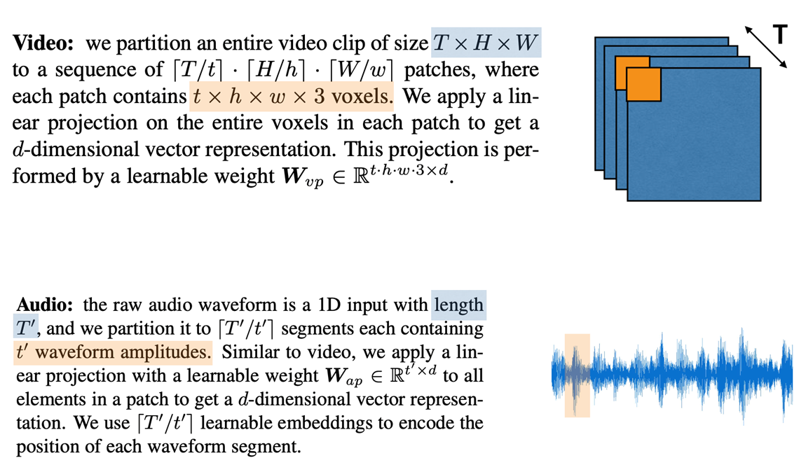 오디오는 그림과 같은 waveform에서 길이 T’을 진폭인 t’로 segment를 나누어 patch sequence로 분할한 후 비디오에서의 포지셔널 인코딩 과정을 진행한다.