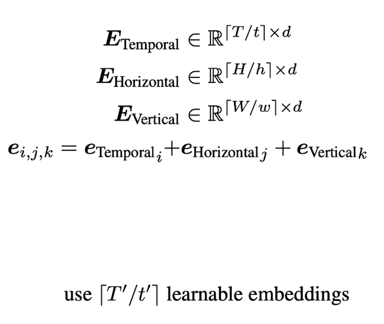 비디오의 클립사이즈를 파랑색 사각형처럼 T, H, W(time, height, width)라고 하고, 비디오 패치를 주황색 사각형처럼 t,h,w라고 하면 클립을 patch로 나누어 seqence로 분할한다. 이후 patch마다 transformer의 d차원으로 linear-mapping을 진행한다. 각각의 patch에 대한 PE를 구하고, temporal, horizontal, vertical 3개 축에 PE를 learnable하게 만든다.