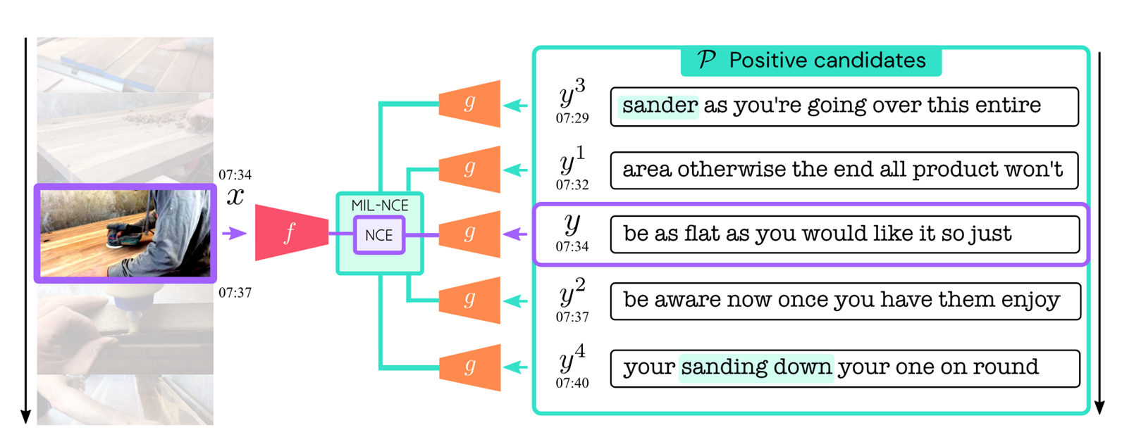 7분 34초를 중심으로, 앞 뒤 시간에 있는 text에서 sander를 나타내는 것을 positive sample이라고 가정하고 MIL-NCE loss를 학습한다.