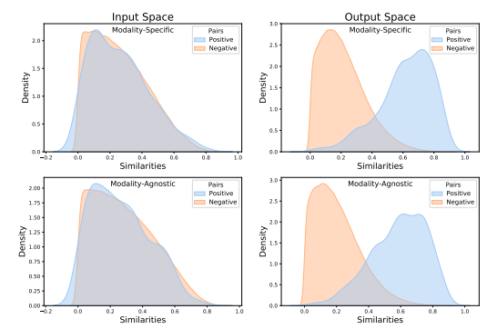 - 영상 모드에 최적화된 모델(b)과 modality에 무관하게 학습된 모델(c)의 representation 차이에 큰 차이가 없다