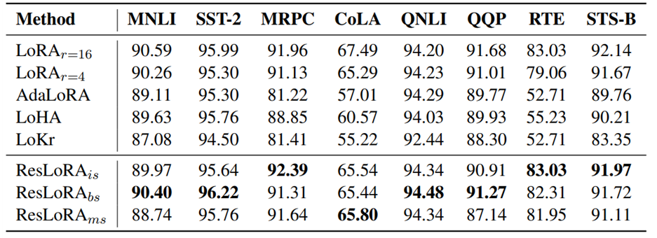 training에서의 LoRA 블록에 다양한 residual path를 추가하는 ResLoRA