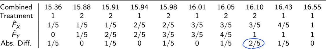 그렇지 않다면 다른 CDF가 나타날 것이므로, Emprical CDF( 데이터 포인트마다 1/n jump하는 분포)를 기반으로 차이가 가장많이 나는 값간에 차이가 가장 큰 값을 test statistic으로 사용함.