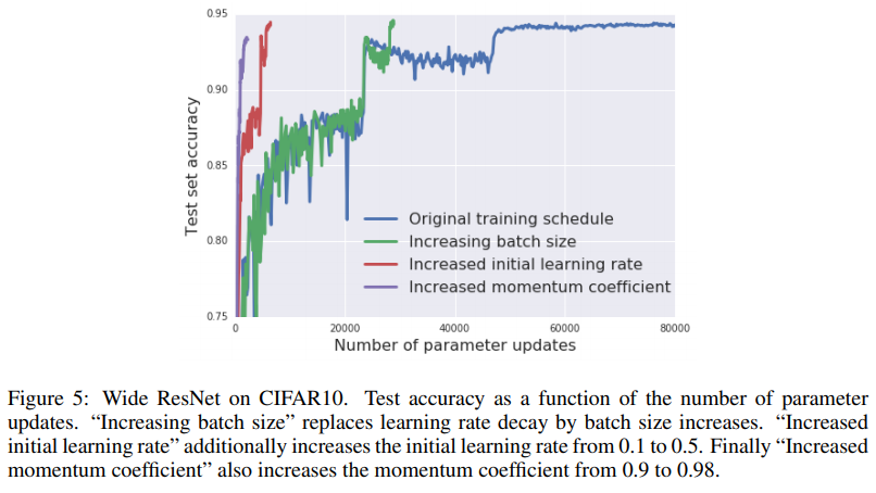 - Increasing batch size : learning rate를 유지하면서 batch size를 $5$배씩 늘리기