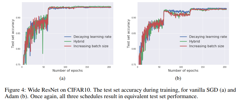 - 5.1 Simulated annealing in a wide RESNET: CIFAR-10에서 Wide ResNet을 사용한 실험을 통해 3가지 scheculing rule에 대해 learning 감소와 batch size 증가 결과가 동일함을 알 수 있다.