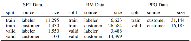 이 프롬프트를 바탕으로 SFT, RM, PPO의 세 가지 데이터셋을 생성하였습니다. 각 데이터셋에 대한 자세한 내용은 다음과 같습니다.