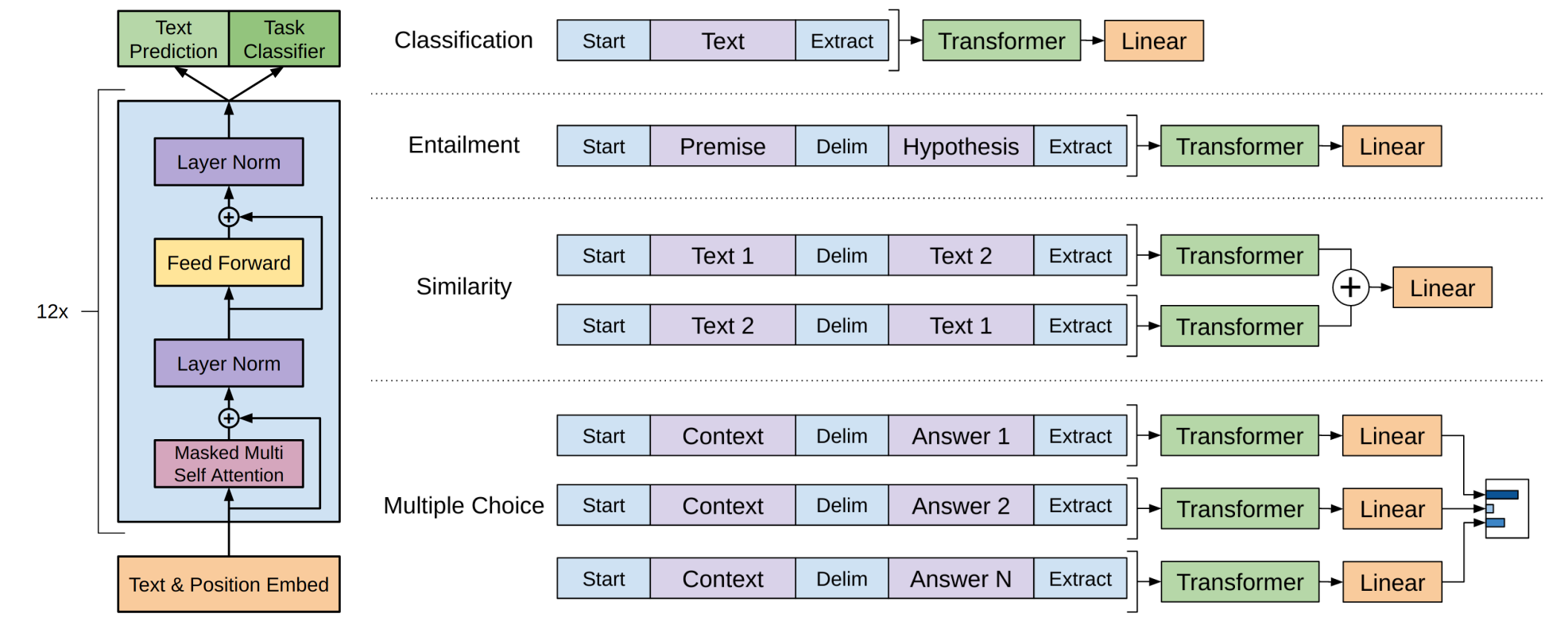 수식 (1)이 사전 학습에서 다음 토큰에 대한 확률이고, 수식 (2)는 파인 튜닝 과정 단계에 대한 것입니다. $h_n$과 $h_l^m$은 모두 트랜스포머 블럭의 마지막 은닉 상태를 의미하기 때문에 차이는 $W_e$와 $W_y$ 뿐입니다. 결국 GPT는 다운스트림 태스크가 무엇이든 모델 아키텍처를 변형하지 않고 파인튜닝이 가능하다는 것입니다. 태스크에 따라 달라지는 것은 레이블 개수에 따른 $W_y$의 차원 뿐입니다.