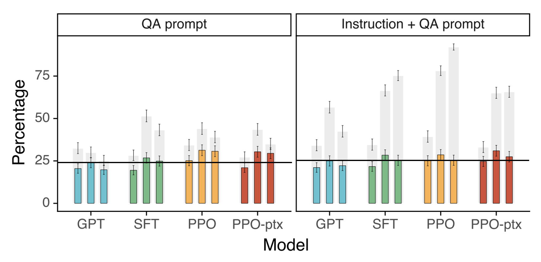 InstructGPT는 GPT-3에 비해 truthfulness가 높은 응답을 출력합니다. 회색 막대는 truthfulness만을 평가한 것이고, 색이 있는 막대는 truthfulness와 informativeness를 함께 평가한 것입니다. 마찬가지로 Toxicity도 InstructGPT가 GPT-3에 비해 개선된 모습을 보여줬지만, bias에 대해서는 크게 개선되지 않았습니다.