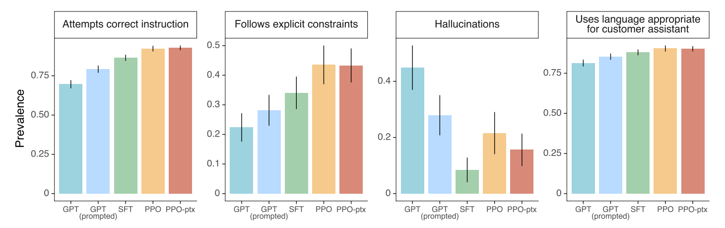 기존의 언어 모델의 훈련 목표는 인터넷에 있는 텍스트를 사용하여 다음 토큰 예측을 하도록 학습되는데, 이는 사용자의 명령에 따라 유용한 응답을 내는 것과는 다른 방향으로 설계되었기 때문에 이러한 현상이 발생했습니다. 이를 기술적인 용어로는 language modeling objective가 misaligned 되어있다고 말합니다. 언어 모델 배포를 위해서는 의도하지 않은 동작을 예방할 필요가 있습니다.