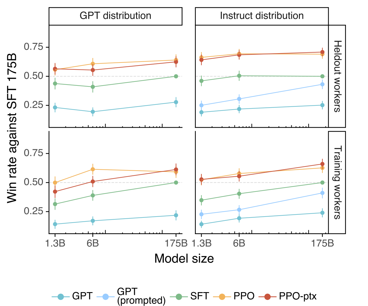InstructGPT와 성능 비교에 사용된 모델은 GPT-3, few-shot 프롬프트를 사용한 GPT-3, SFT 모델과 PPO 모델입니다. 추가로 GPT-3을 FLAN과 T0 데이터셋으로 파인튜닝한 모델도 사용하였습니다.