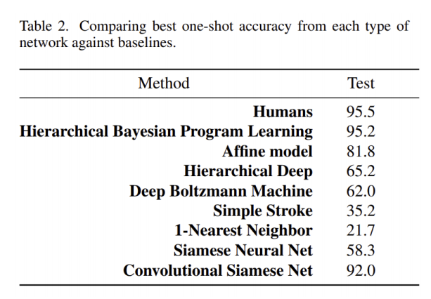 - Hierarchical Bayesian Program Learning (HBPL), needs information of stroke order. Unlike HBPL, Convolutional Siamese Net does not need any domain knowledge.