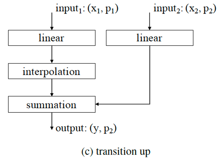 Transition down에서 줄어든 point set의 크기를 이전의 크기로 키워준다.