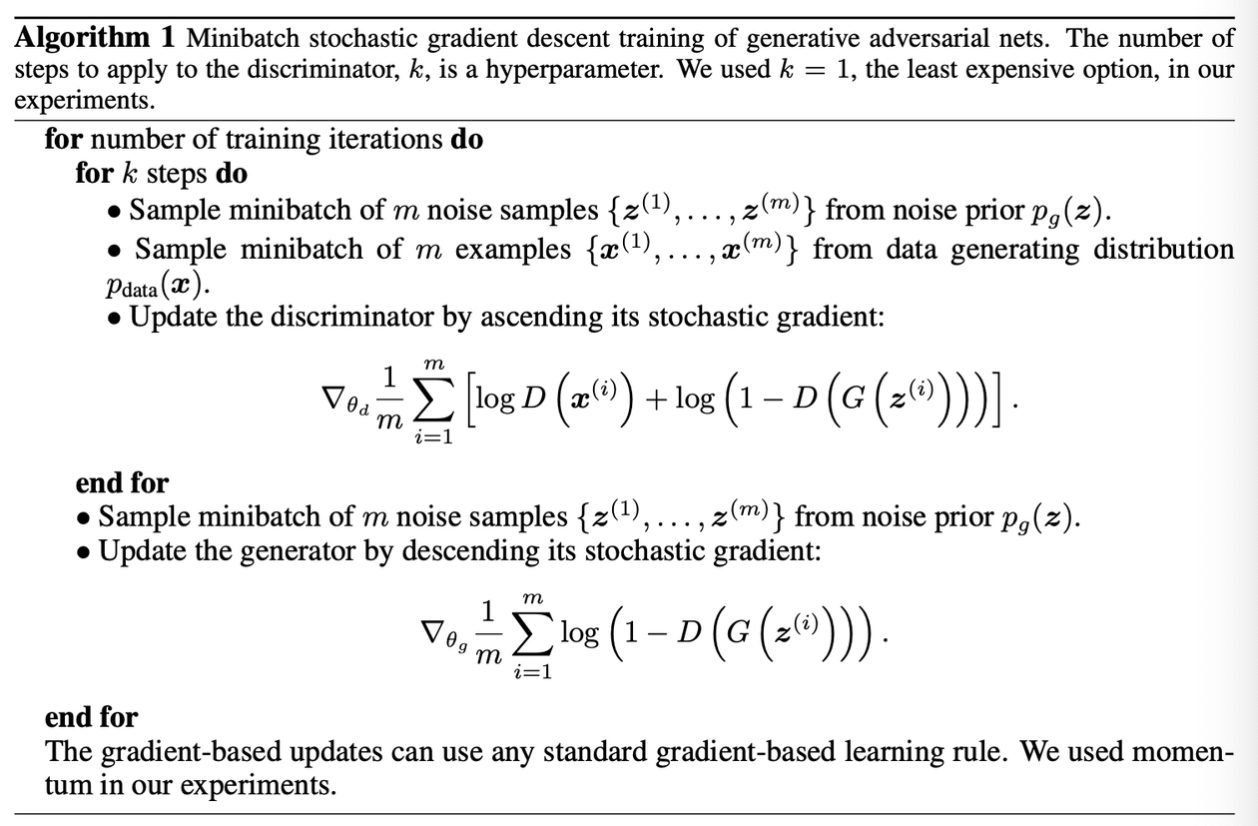 • $D$를 최적화하는 k steps(k는 hyper parameter)& $G$를 최적화하는 one step → 이는 $G$가 천천히 변하는 한 $D$는 최적의 솔루션 근처에서 유지되게 함