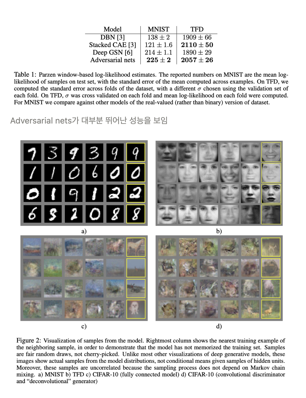 • 그림 2와 3 → 훈련 후 생성자 네트워크에서 생성된 샘플을 보여준다. 이 샘플들이 기존의 다른 방법으로 생성된 샘플들보다 낫다는 주장보다는, 이러한 샘플들은 최소한 문헌들에 나오는 더 나은 generative model과 경쟁할 정도임을 주장하며 adversarial framework의 잠재력을 강조한다.