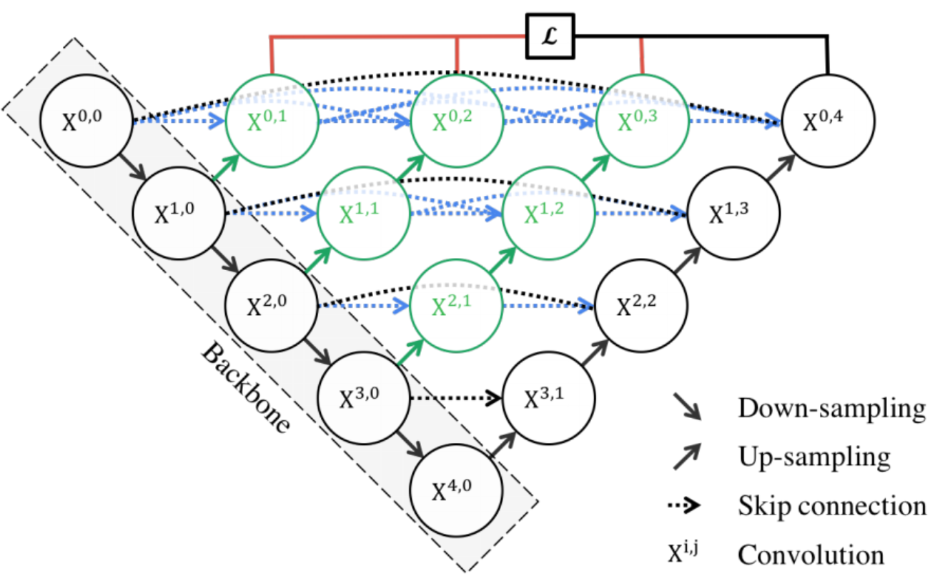 위는 UNet++의 구조를 나타냅니다. 검은색 동그라미와 선은 기존 UNet의 구조를 의미하는 것이고, 파란색 선과 초록색 선은 UNet++의 추가적인 아이디어를 의미합니다. 이것을 조금 더 자세하게 알아보겠습니다.