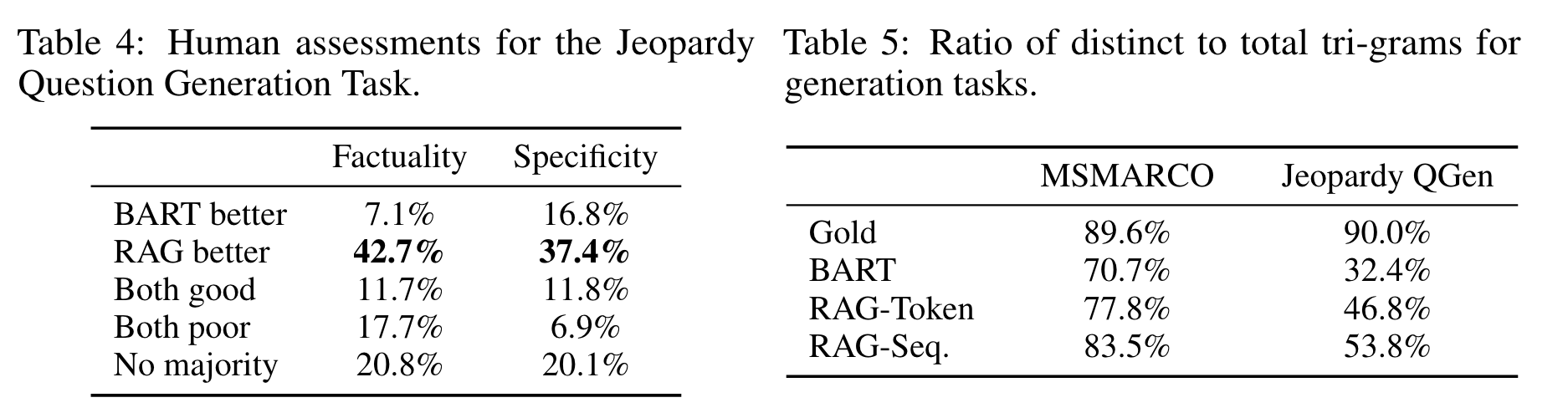 Language Generation task의 경우 RAG model이 SOTA를 달성한 seq2seq baseline보다 더 구체적이고 다양하며 사실적인 언어를 생성하는것을 보여준다.