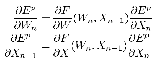 X_n은 모듈의 출력을 의미하는 벡터이고, W_n은 학습 가능한 모듈의 매개변수입니다. X_(n-1)은 이전 모듈의 출력입니다. X_0는 모델의 첫 입력이며 입력 패턴인 Z^p와 같습니다. 시스템 전체의 손실함수 E^p를 각각 W_n, X_(n-1)에 대해 편미분 한 것은 다음과 같습니다.