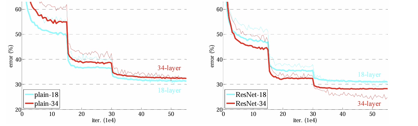 Residual learning이 없는 plain network는 layer의 개수가 늘어남에 따라 성능이 감소한 반면 ResNet은 layer의 개수가 늘어남에 따라 성능이 향상되었음을 알 수 있습니다.