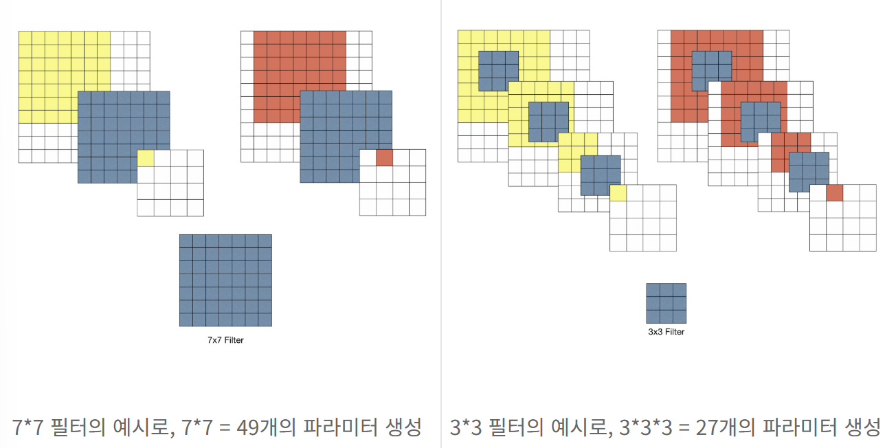 CNN에서 필터를 거칠수록 이미지의 크기는 줄어들게 됩니다. 따라서 3x3 필터를 사용해 이미지의 크기가 크기가 큰 필터를 사용할 때 보다 적게 줄어들게 하여 층을 깊게 합니다. 위 예시를 보면 7x7 필터를 한번 사용하여 만든 feature map과 3x3 필터를 3번 사용하여 만든 feature map의 크기가 동일한 것을 알 수 있습니다. 이는 층을 깊게 할 수 있고 또한 파라미터의 개수도 더 적어지게 됩니다. 파라미터의 개수가 적다는 것은 그만큼 학습할 변수가 줄어드는 것이므로 학습의 효율성 측면에서 좋습니다.