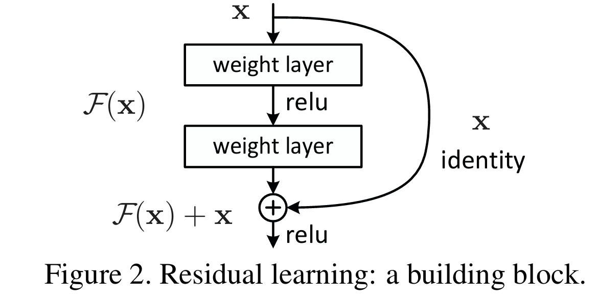 위 layer을 통해 얻고 싶은 값을 H(x)라고 하면 H(x) = F(x) + x가 됩니다. 이때 네트워크가 학습해야 할 목표 함수인 H(x)를 직접 학습하는 대신 입력 데이터에 대한 잔차(residual) F(x) = H(x) - x 만을 학습하는 것이 residual learning입니다. 입력 값인 x를 추가함으로써 x를 제외한 나머지 부분인 F(x)만 학습하면 되므로 학습량이 상대적으로 줄어드는 효과가 있습니다. 또한 Identity shortcut connection을 통해 추가적인 파라미터 없이 간단하게 구현할 수 있는 장점이 있습니다.