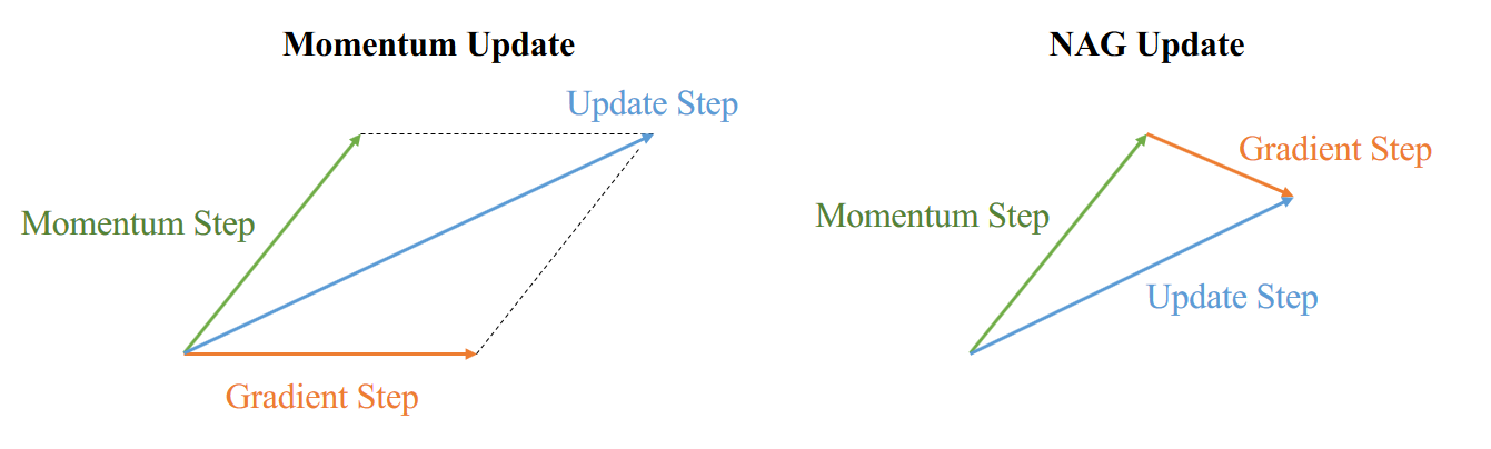 이후 등장한 NAG (Nesterov accelerated gradient)는 Momentum의 원리를 기반으로 minimum으로 도달하는 속도를 더 높이는 알고리즘이다. 현재 parameter의 gradient를 사용하던 momentum의 방식과 달리, 우선 현재 parameter 기준으로 momentum만큼 이동하여 구한 다음 paremeter에 대해 gradient를 연산하는 방식이다.