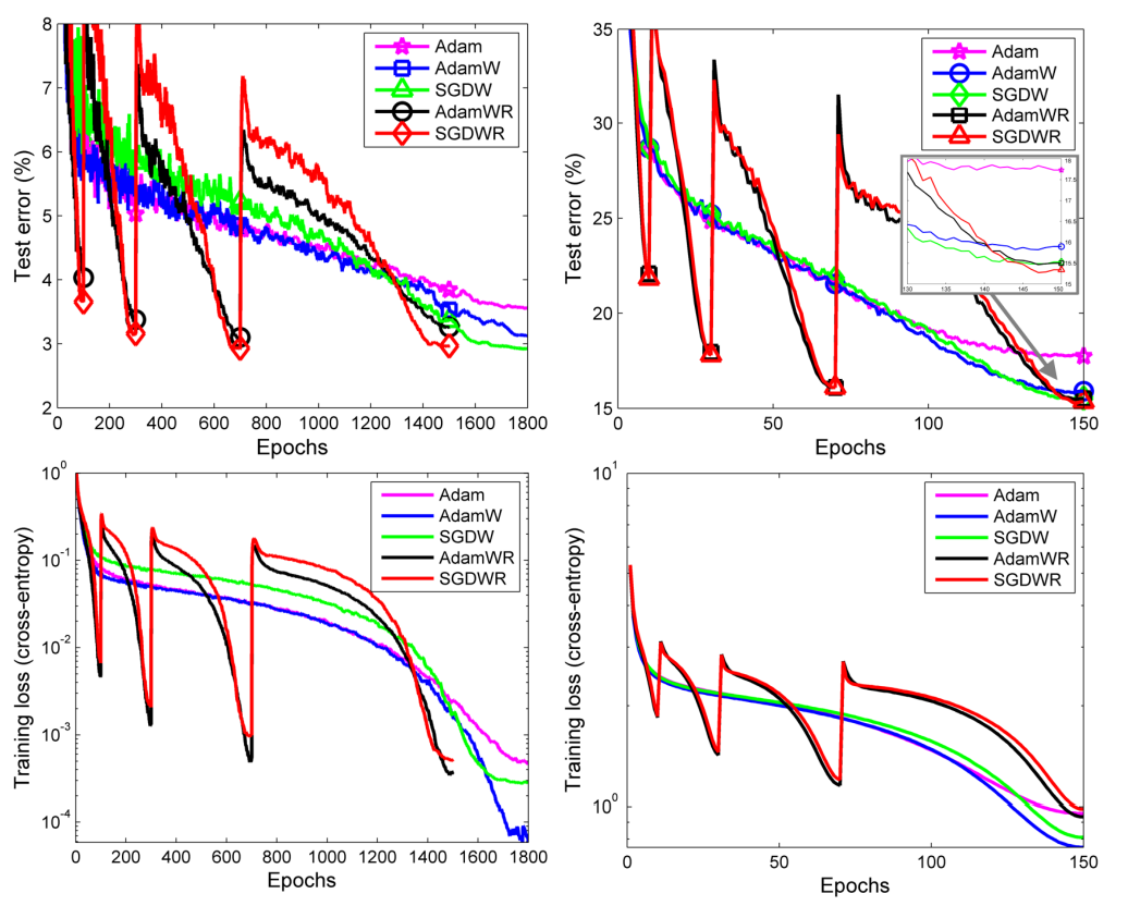 Gerneralization 능력을 더욱 향상하기 위해, 논문에서는 AdamWR이라는 알고리즘을 추가적으로 제시하고 있다. Learning rate을 의도적으로 조정하여 좋은 최적점에 도달하도록 하는 것을 learning rate annealing이라고 하는데, 보통은 learning rate을 지속적으로 감소하여 설계하는 것이 일반적이나 AdamWR에서는 중간중간 learning rate을 증가시키는 모습을 보여주었다(Warm restart). 이는 비교적 가파르게 변하는 local minimum에서 최적점이 형성될 확률을 낮추므로, 각 data별 generalized된 test loss를 얻기에 적합하다. 쉽게 말해, 학습데이터별로 서로 다르게 측정되는 예측치가 비교적 균등하게 출력된다는 것이다.