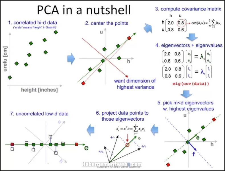 - PC를 찾기 위해서는 Covariance Matrix(공분산 행렬)에서 Eigenvalue가 가장 큰 값인 Eigenvector(고유 벡터)를 찾아야한다.