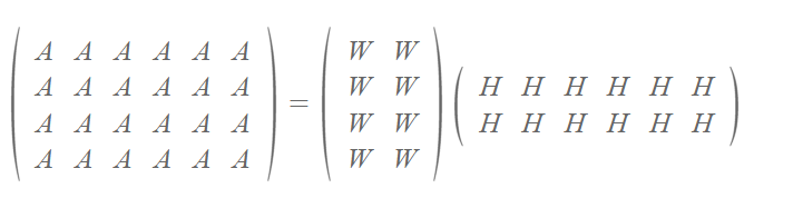 - 이제 행렬 분해를 통해 결측치를 채우고 잠재 요인을 분석할 수 있습니다. 예를 들어 R 행렬은 4x6 크기의 행렬이고 4x2와 2x6 크기의 행렬로 분해된다고 가정합시다.