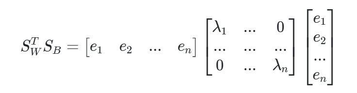 - 클래스 내부 분산 행렬을 SW, 클래스 간 분상 행렬을 SB라고 하면, 다음 식으로 두 행렬을 고유벡터로 분해할 수 있음