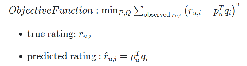 - 즉 Rating Matrix를 P와 Q로 분해하여 R과 최대한 유사한 R^을 추론 하는 것이다.