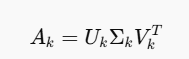 - 이와 동시에 $U$와 $V^T$ 행렬에서도 $k$에 대응하는 부분만 남겨 $U_k$와 $V_K^T$를 생성하고 새로운 행렬 $A_k$를 계산할 수 있습니다.