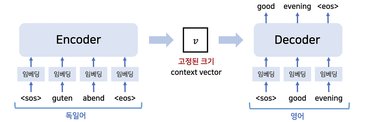 -인코더에서는 입력 시퀀스를 단어의 수와 상관없는 하나의 context vector로 표현하고, 이를 기반으로 디코더에서 시퀀스를 출력한다.