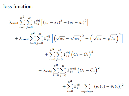 - 첫번째 항 : Object가 존재하는 grid cell i의 예측된 bounding box j에 대해 x,y의 loss 계산