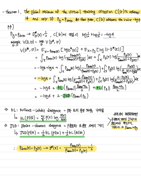 Generator 관점에서 value function은 $Pg$ = $Pdata$에서 global optimum 값을 가져야 한다. $D*(x)$ = $1/2$ 값을 가진다는 건 discriminator가 가짜 이미지와 진짜 이미지를 판별할 확률이 $1/2$이라는 것이다. 즉, 가짜와 진짜를 구별하지 못하는 상태이다. 이처럼 $V(D, G)$값이 $1/2$에 도달하면 학습을 종료한다.