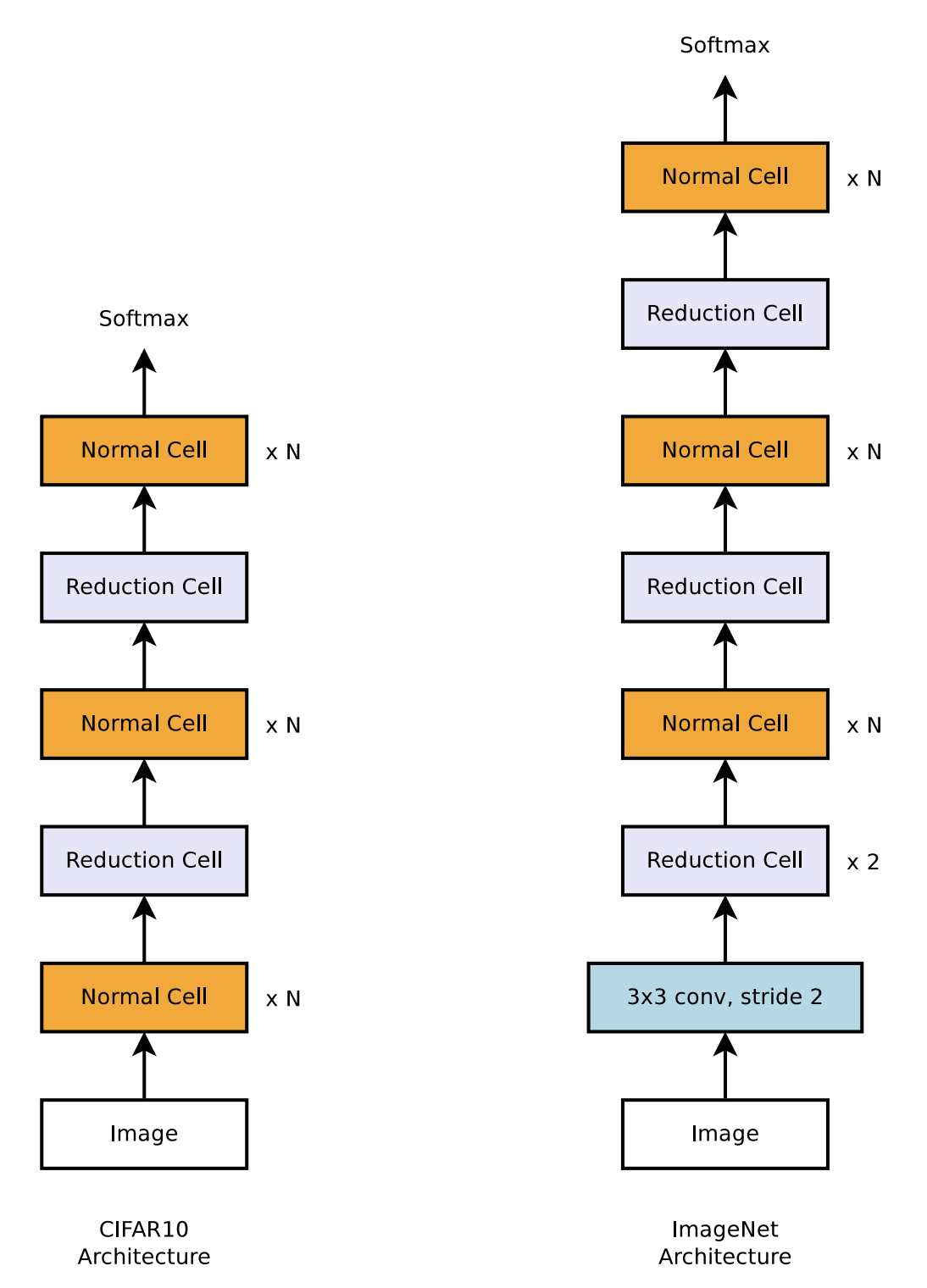 - 작은 데이터셋으로 찾은 셀 구조를 search space로 설정하여 반복적인 학습을 통해 나온 최적의 셀 구조를 큰 데이터셋에 적용한다.