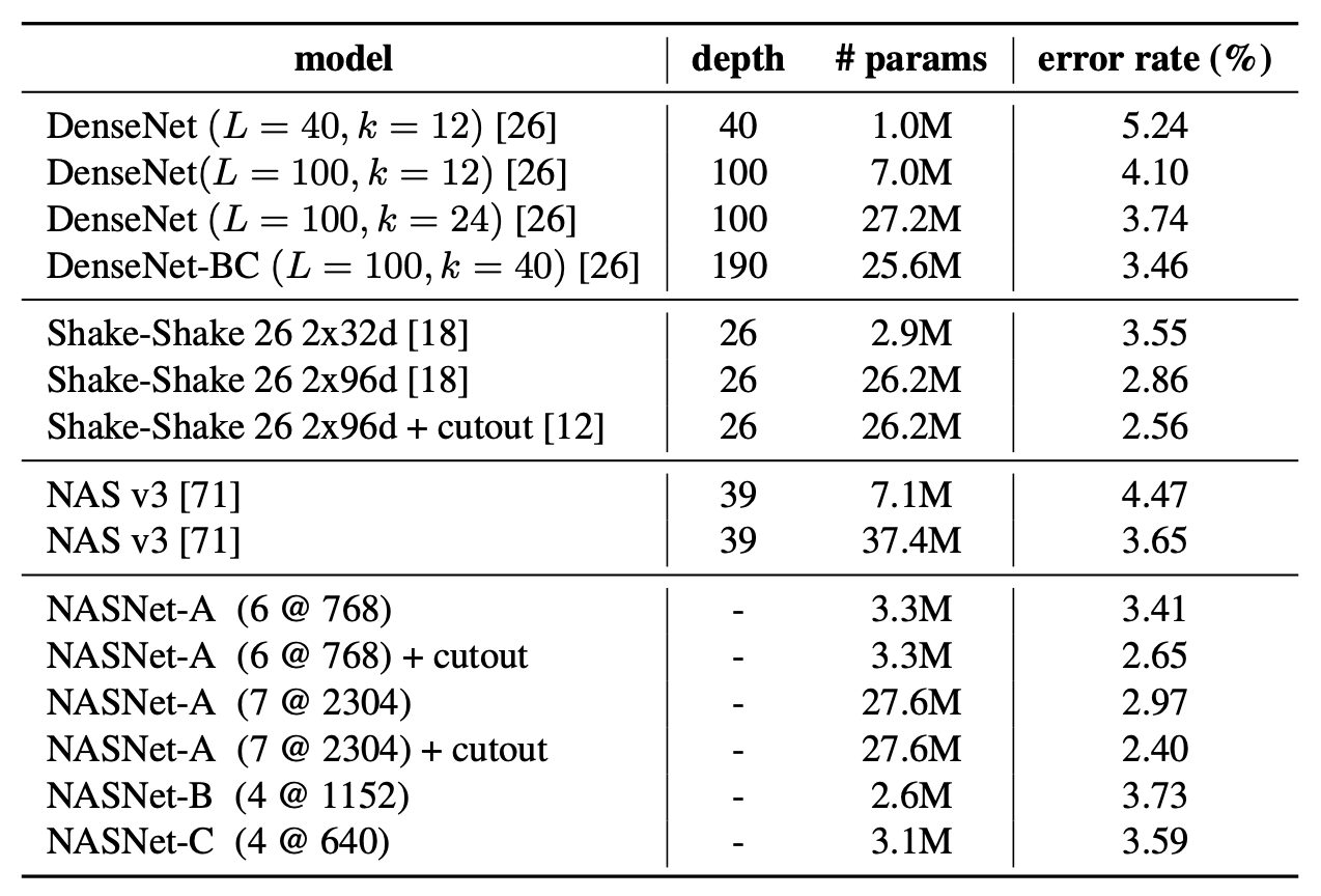 - 500개의 GPU를 사용하여 약 4일 동안 수행한 결과, CIFAR 데이터셋에 대해 최소 2.4%까지의 테스트 오류율을 보인다.