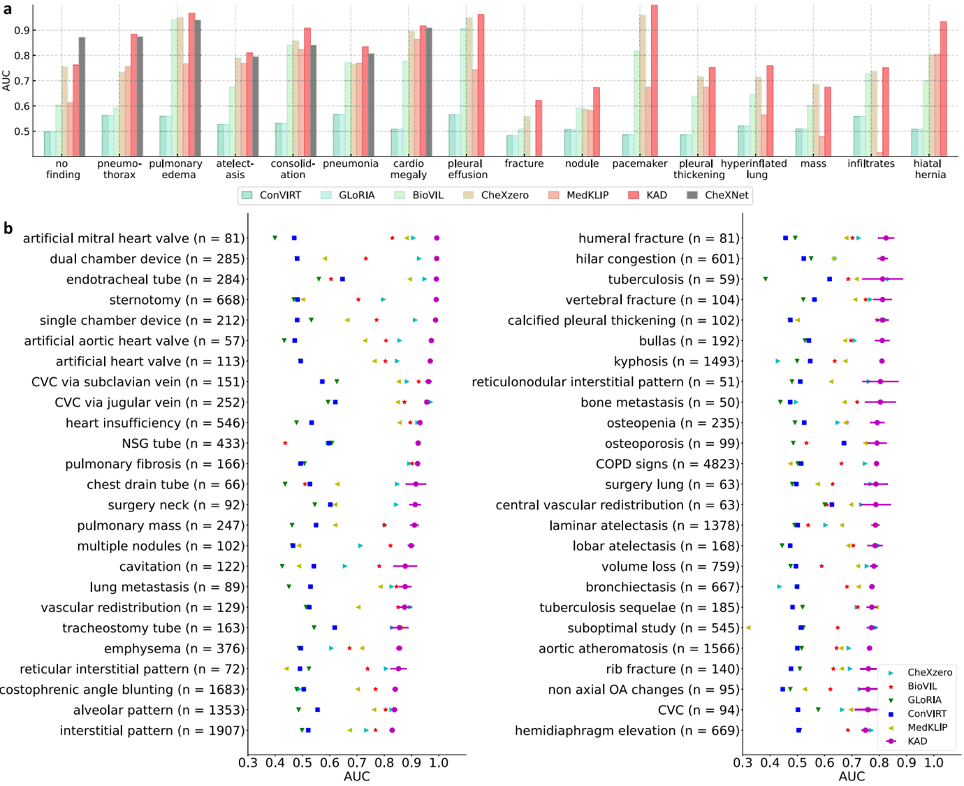 - CheXNet(완전 지도 학습 모델)과 비교했을 때, KAD는 일부 병리에서 더 나은 성능을 보임.