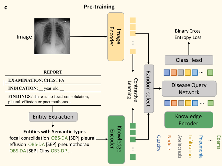 - 사전 학습된 지식 인코더를 사용하여 X-선 이미지와 추출된 엔티티 간의 contrastive learning