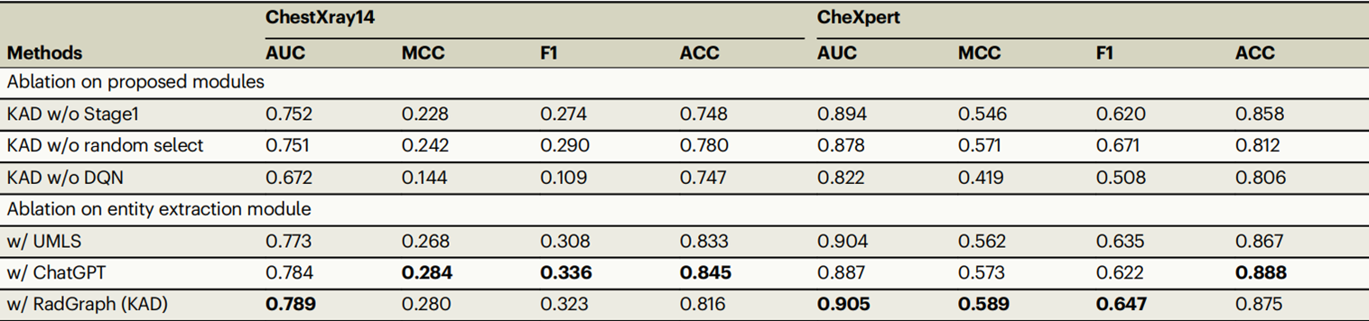- w/ RadGraph: RadGraph를 사용하여 엔티티 추출(KAD 기본 설정).