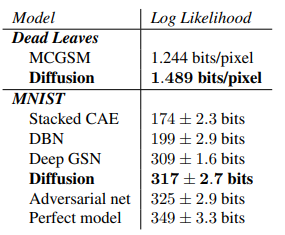 본 논문에서는 diffusion model을 다양한 연속적인 데이터셋과 이진 데이터셋에 학습시켰다. gradient 계산에는 Theano 라이브러리가 사용되었다.