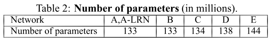 - AlexNet에서 이용되었던 LRN(local response normalisation)을 모델 A에 적용한 결과 큰 성능 향상이 없어 나머지 모델에서는 LRN을 적용 X