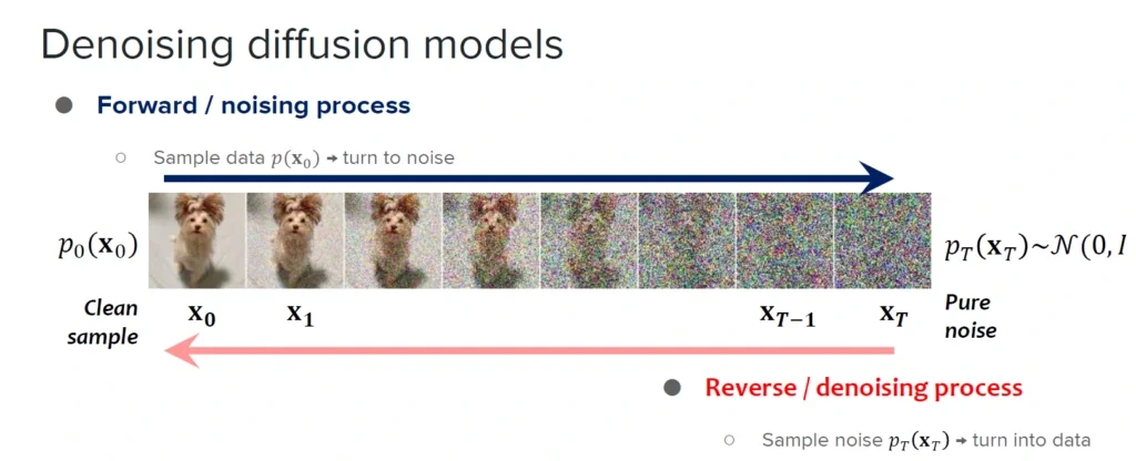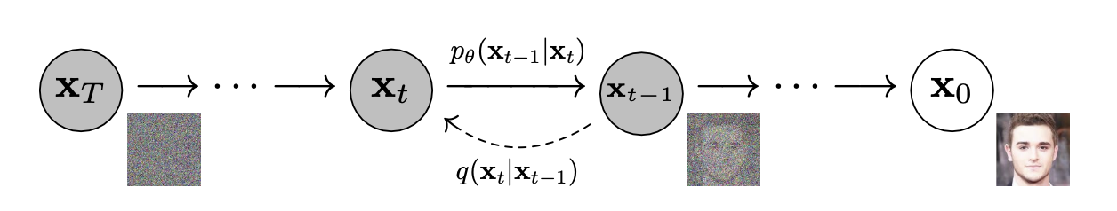 2. 이 체인의 전이는 샘플링과 반대 방향으로 데이터를 점진적으로 노이즈화하여 신호를 파괴하는 확산 과정(diffusion process)을 역으로 수행하도록 학습됩니다.