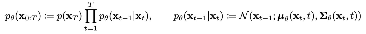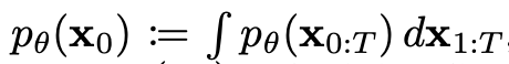 - p_theta(x_0:T): x_T에서 x_0으로 진행하는 모든 단계의 확률을 곱한 것