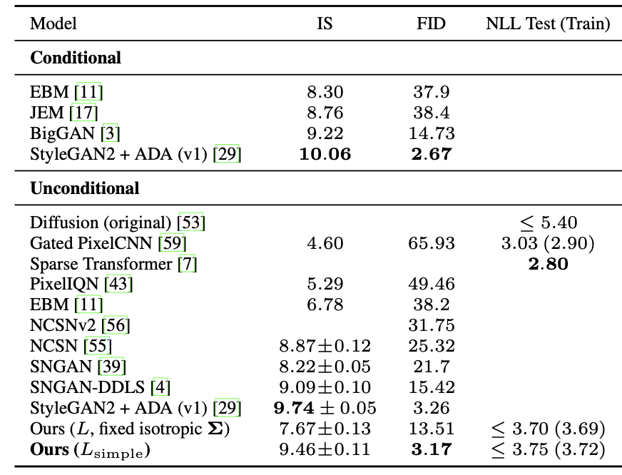 2. 최상의 결과는 확산 확률 모델과 Langevin dynamics 기반의 Denoising Score Matching 간의 새로운 연결을 바탕으로 설계된 가중치가 적용된 변분 하한(weighted variational bound)로 학습함으로써 얻어졌습니다.